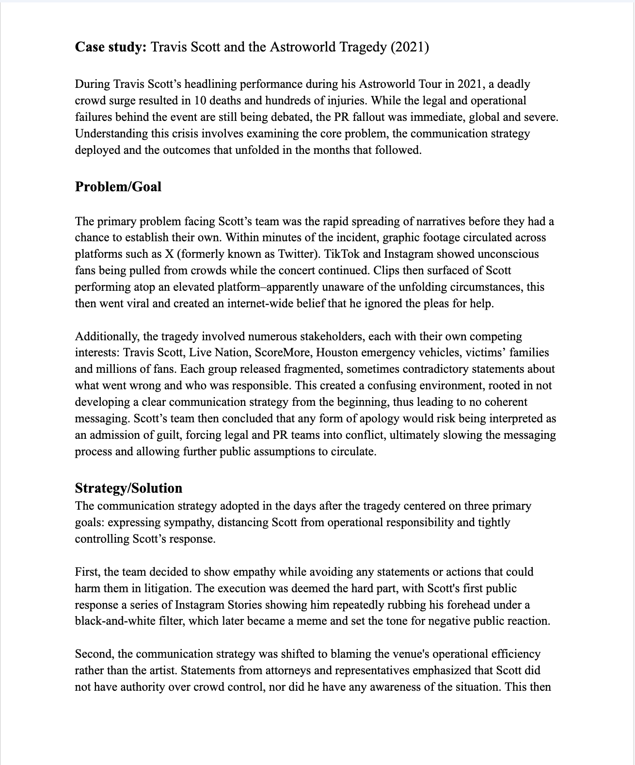 A detailed crisis communication analysis examining the PR response to the 2021 Astroworld tragedy, evaluating the core problems, strategic decisions and long-term repetitional outcomes for Travis Scott and event organizers.
