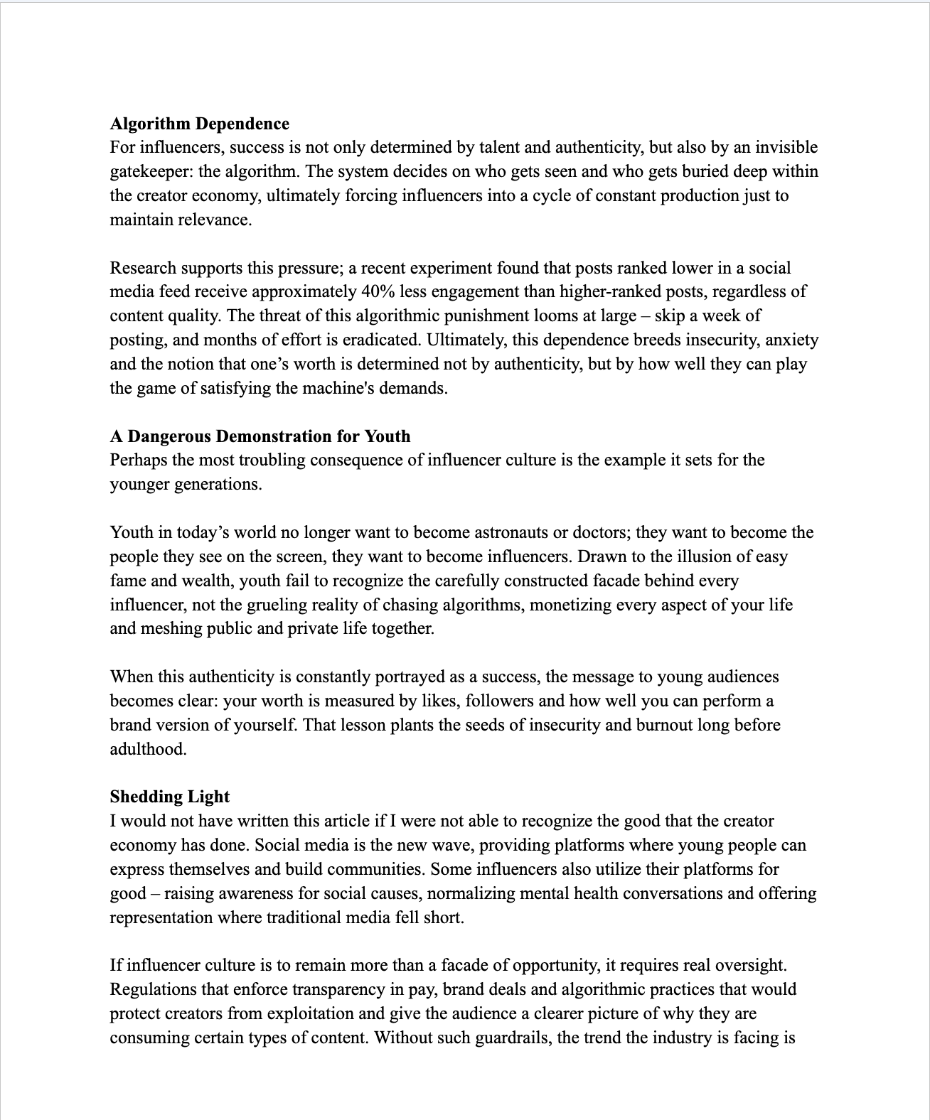 A op-ed analyzing the hidden pressures of influencer culture—examining authenticity, algorithmic dependence and youth impact—while arguing for greater oversight and transparency within the creator economy.
