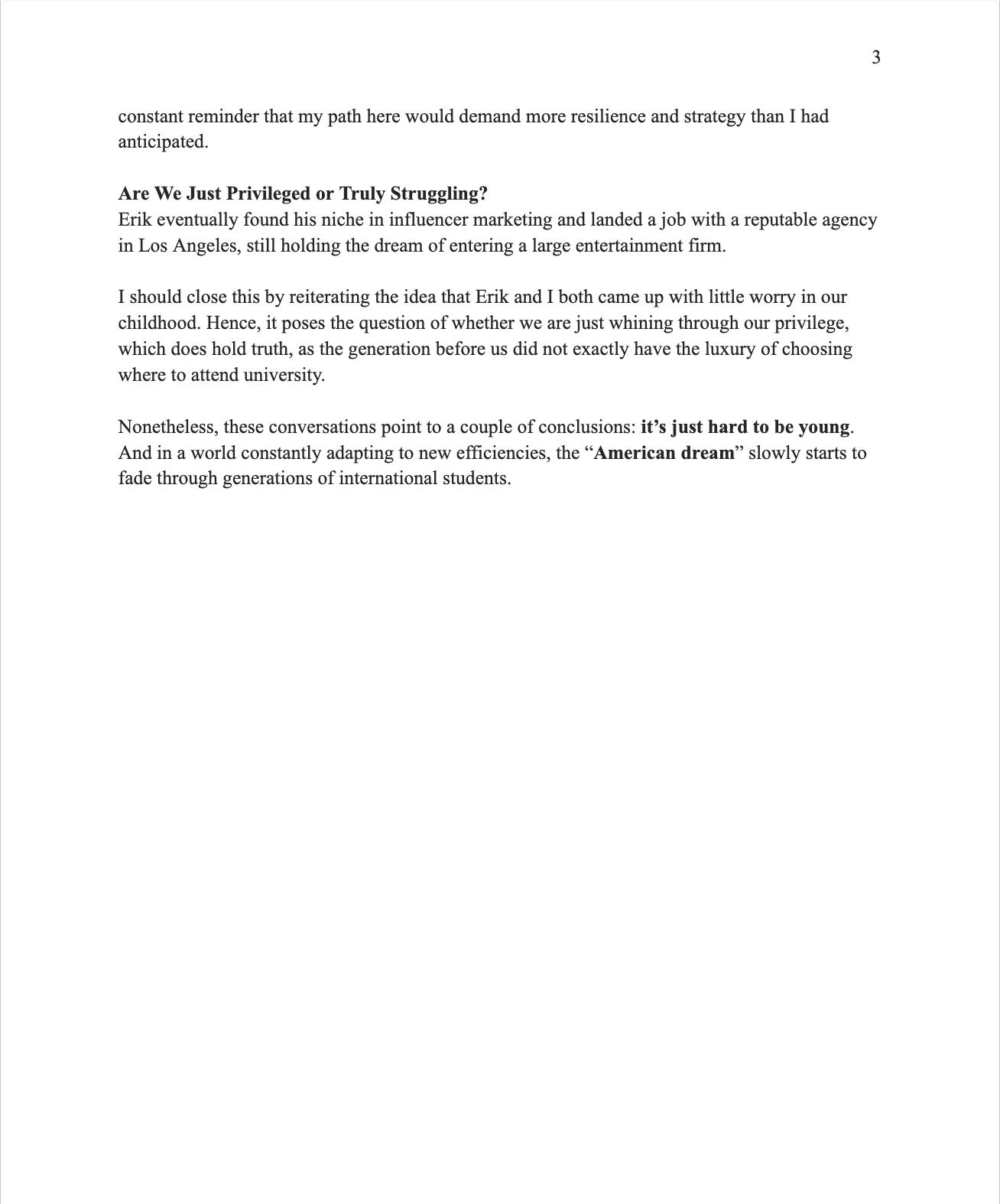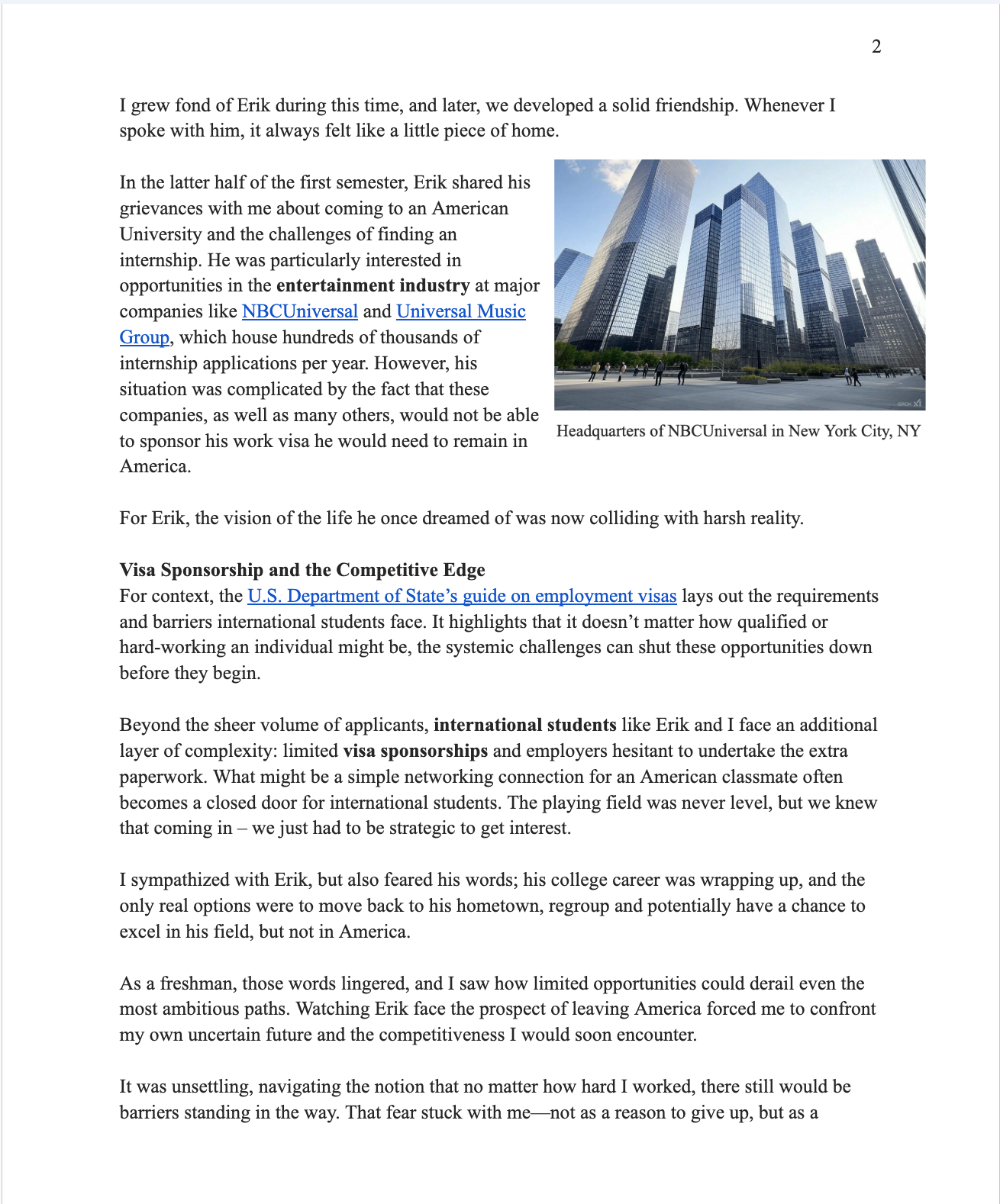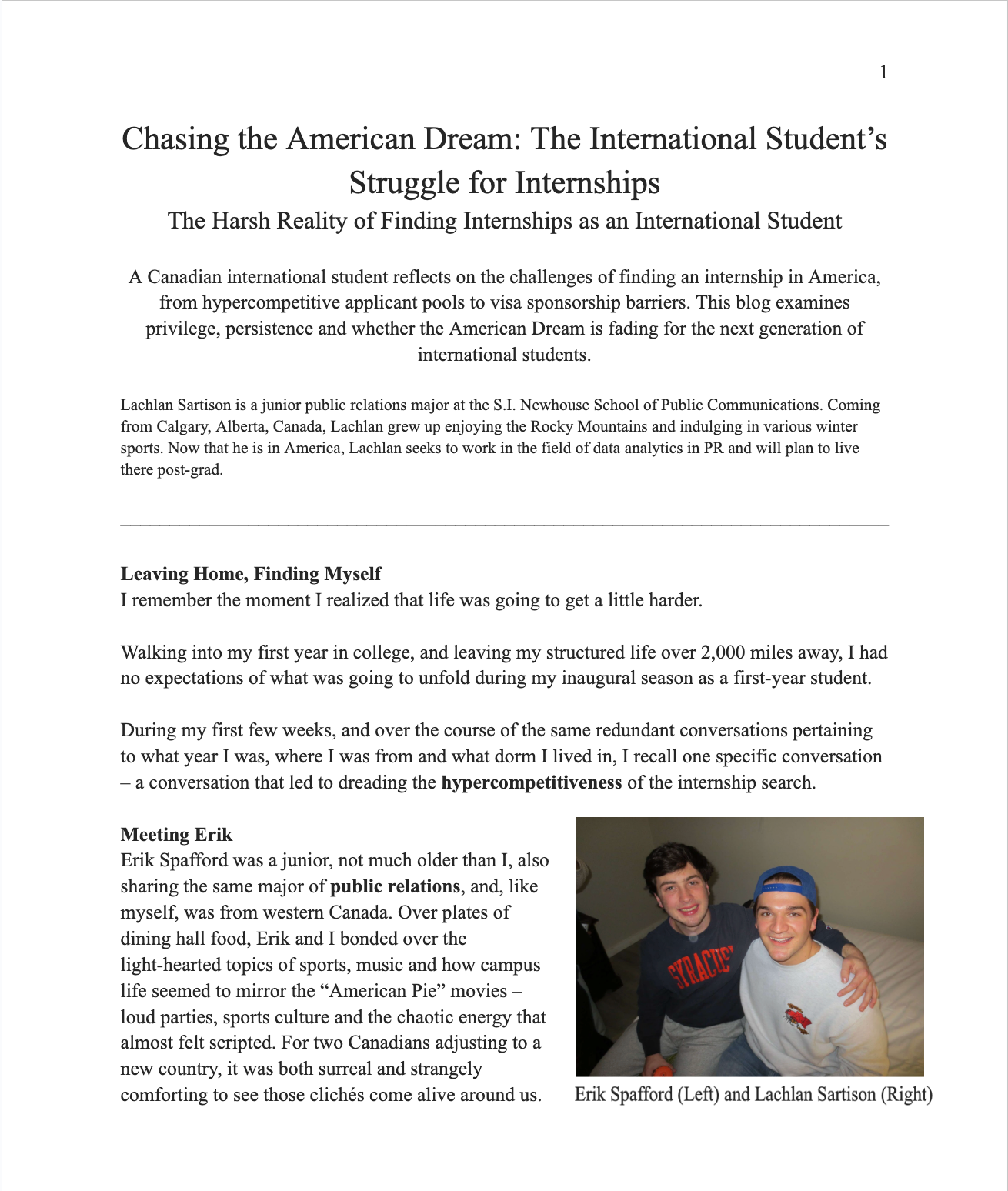 A reflective long-form blog project exploring the challenges international students face in the U.S. internship landscape, blending personal narrative with PR-focused analysis on opportunity and privilege